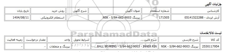 | آرش ایزدی - 05141522288 | 171505 | بیرینگ NSK - S/84-662-9003 | استعلام الکترونیکی | 1404/08/11 |