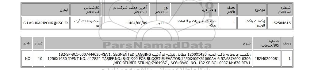 | 52504615 | زیکمنت باکت الویتور | 1 | ساخت تجهیزات و قطعات یدکی | استانی | 1404/08/09 | غلامرضا لشگری پور | G.LASHKARIPOUR@KSC.IR |