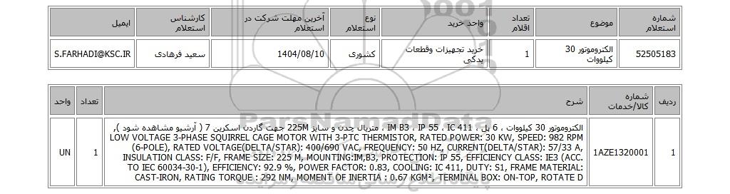 52505183الکتروموتور 30 کیلووات1خرید تجهیزات وقطعات یدکیکشوری1404/08/10سعید فرهادیS.FARHADI@KSC.IR