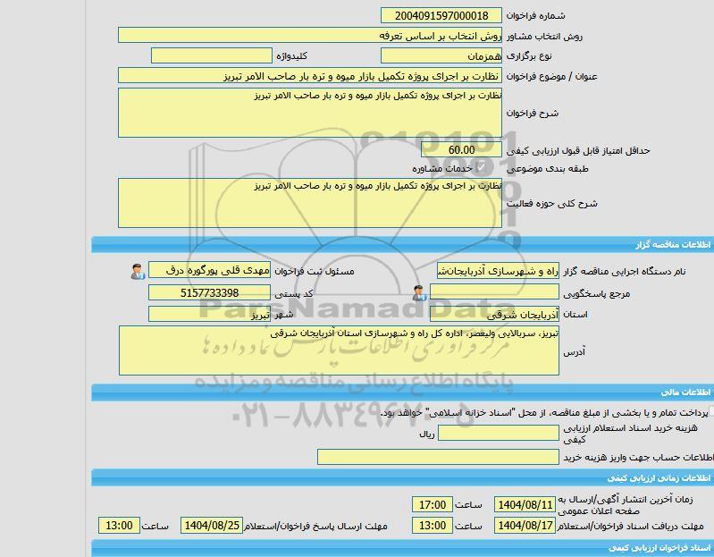 مناقصه خرید خدمات مشاوره نظارت بر اجرای پروژه تکمیل بازار میوه و تره بار صاحب الامر تبریز از کلیه افراد متخصص و شرکتها واجد شرایط دعوت به عمل میآید در مناقصه با کد خبرگزاری پارس نماد: 9789455 شرکت نمایند.