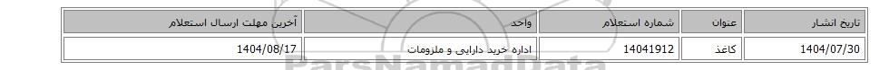 | 1404/07/30 | کاغذ | 14041912 | اداره خرید دارایی و ملزومات | 1404/08/17 |