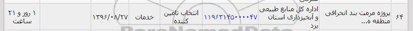 | پروژه مرمت بند انحرافی منطقه ه... | اداره کل منابع طبیعی و آبخیزداری استان یزد | 11963145000047 | انتخاب تامین کننده | خدمات | 96.8.27 | 1 روز و 21 ساعت |