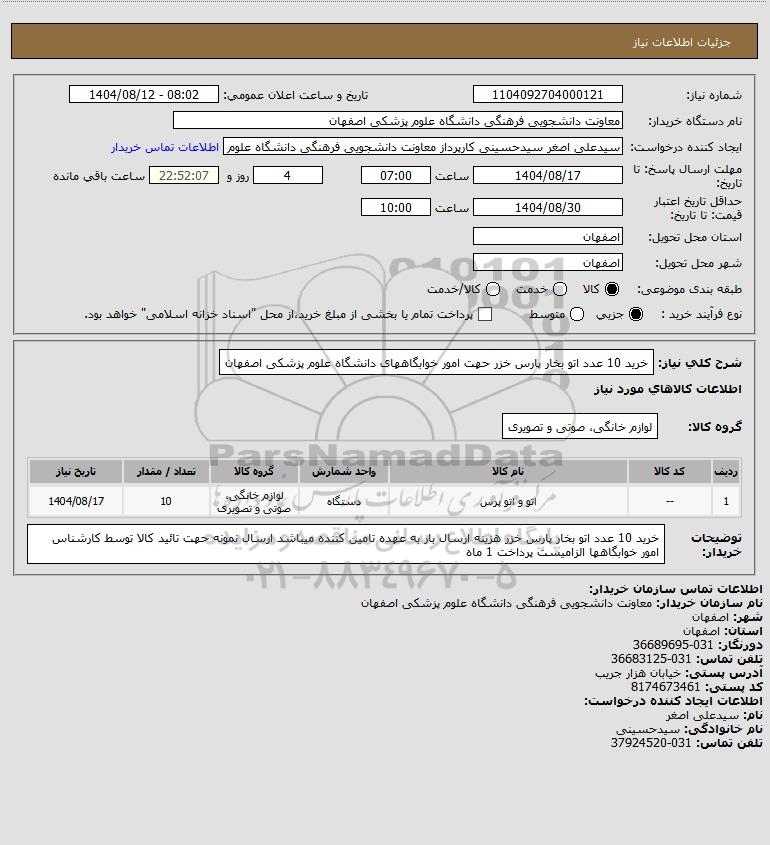شرح کلی نیاز: خرید 10 عدد اتو بخار پارس خزر حهت امور خوابگاههای دانشگاه علوم پزشکی اصفهان