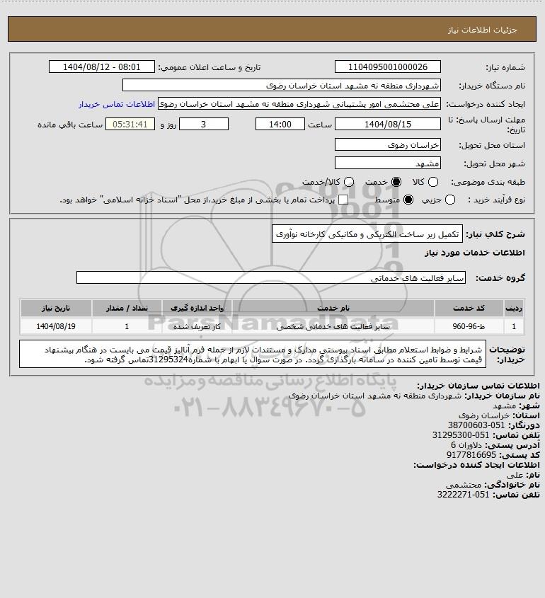 استعلام بها و موضوع استعلام استعلام تکمیل زیر ساخت الکتریکی و مکانیکی کارخانه نوآوری به اطلاع کلیه شرکتها و افراد متخصص واجد شرایط میرساند، آگهی گذار در نظر دارد از طریق استعلام بها، نسبت به انتخاب و دریافت پیشنهادات اقدام نماید. این استعلام با کد آگهی ثبت شده در سامانه خبرگزاری پارس نماد : 9790456 منتشر شده است. مشخصات استعلام : تاریخ شروع استعلام: 1404/08/12 آخرین مهلت ارسال پیشنهاد قیمت : 1404/08/15 و محل اجرای پروژه : استان مناقصات استان خراسان رضوی میباشد. استعلام قیمت مورد درخواست : استعلام تکمیل زیر ساخت الکتریکی و مکانیکی کارخانه نوآوری با دستهبندیهای تخصصی و گروه های مرتبط : پیمانکاری برق و الکترونیک, تاسیسات ساختمانی, ساختمان, استعلام اطلاع رسانی میگردد.