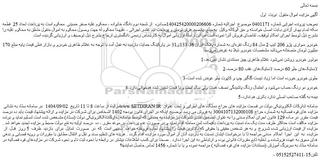 مزایده خودرو سواری پژو 206 تیپ 2 مدل 84 رنگ نقره ای, مزایده خودرو سواری پژو 206 تیپ 2 مدل 84 رنگ نقره ای