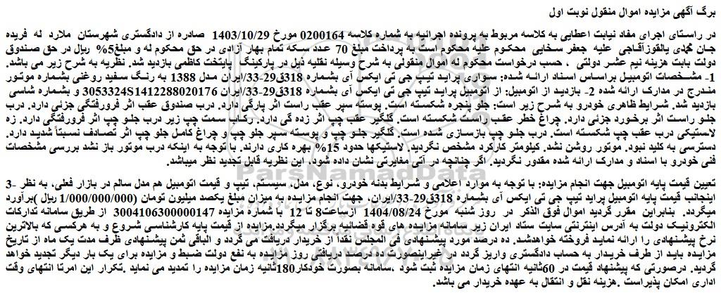 در راستای اجرای مفاد نیابت اعطایی به کلاسه مربوط به پرونده اجرائیه به شماره کلاسه 0200164 مورخ 1403/10/29 صادره از دادگستری شهرستان ملارد له فریده جان محمدی یالقوزآقاجی علیه جعفر سخایی محکوم علیه محکوم است به پرداخت مبلغ 70 عدد سکه تمام بهار آزادی در حق محکوم له و مبلغ5% ریال در حق صندوق دولت بابت هزینه نیم عشر دولتی ، حسب درخواست محکوم له اموال منقولی به شرح وسیله نقلیه ذیل در پارکینگ پایتخت کاظمی بازدید شد. نظریه به شرح زیر می باشد. 1- مشخصات اتومبیل براساس اسناد ارائه شده: سواری پراید تیپ جی تی ایکس آی بشماره 318ق29-33/ایران مدل 1388 به رنگ سفید روغنی بشماره موتور 3053324 و بشماره شاسی s1412288020176 مندرج در مدارک ارائه شده 2- بازدید از اتومبیل: از اتومبیل پراید تیپ جی تی ایکس آی بشماره 318ق29-33/ایران بازدید شد. شرایط ظاهری خودرو به شرح زیر است: جلو پنجره شکسته است. پوسته سپر عقب راست اثر پارگی دارد. درب صندوق عقب اثر فرورفتگی جزئی دارد. درب جلو راست اثر برخورد جزئی دارد. چراغ خطر عقب راست شکسته است. گلگیر عقب چپ اثر زده گی دارد. رکاب سمت چپ زیر درب جلو چپ اثر فرورفتگی دارد. زه لاستیکی درب عقب چپ شکسته است. درب جلو چپ بازسازی شده است. گلگیر جلو چپ و پوسته سپر جلو چپ و چراغ کامل جلو چپ اثر تصادف نسبتاً شدید دارد. دسترسی به کلید نبود. موتور روشن نشد. کیلومتر کارکرد مشخص نگردید. لاستیکها حدود 15% بهره کاری دارند. با توجه به اینکه درب موتور باز نشد بررسی مشخصات فنی خودرو با اسناد و مدارک ارائه شده مقدور نگردید. اگر چنانچه در آتی مغایرتی نشان داده شود، این نظریه قابل تجدید نظر میباشد.