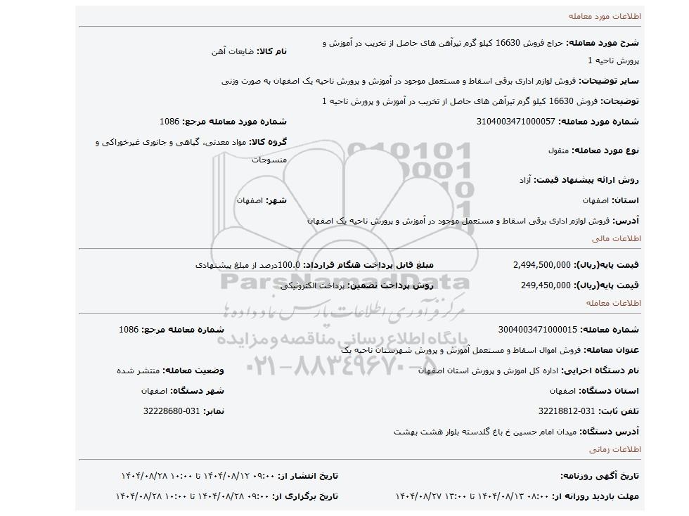 | سایر توضیحات: فروش لوازم اداری برقی اسقاط و مستعمل موجود در آموزش و پرورش ناحیه یک اصفهان به صورت وزنی | ||