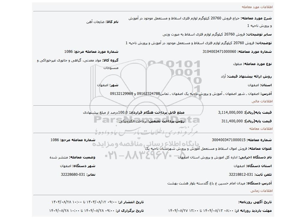 | شرح مورد معامله: حراج فروش 20760 کیلوگرم لوازم فلزی اسقاط و مستعمل موجود در آموزش و پرورش ناحیه 1 | نام کالا: ضایعات آهن | |