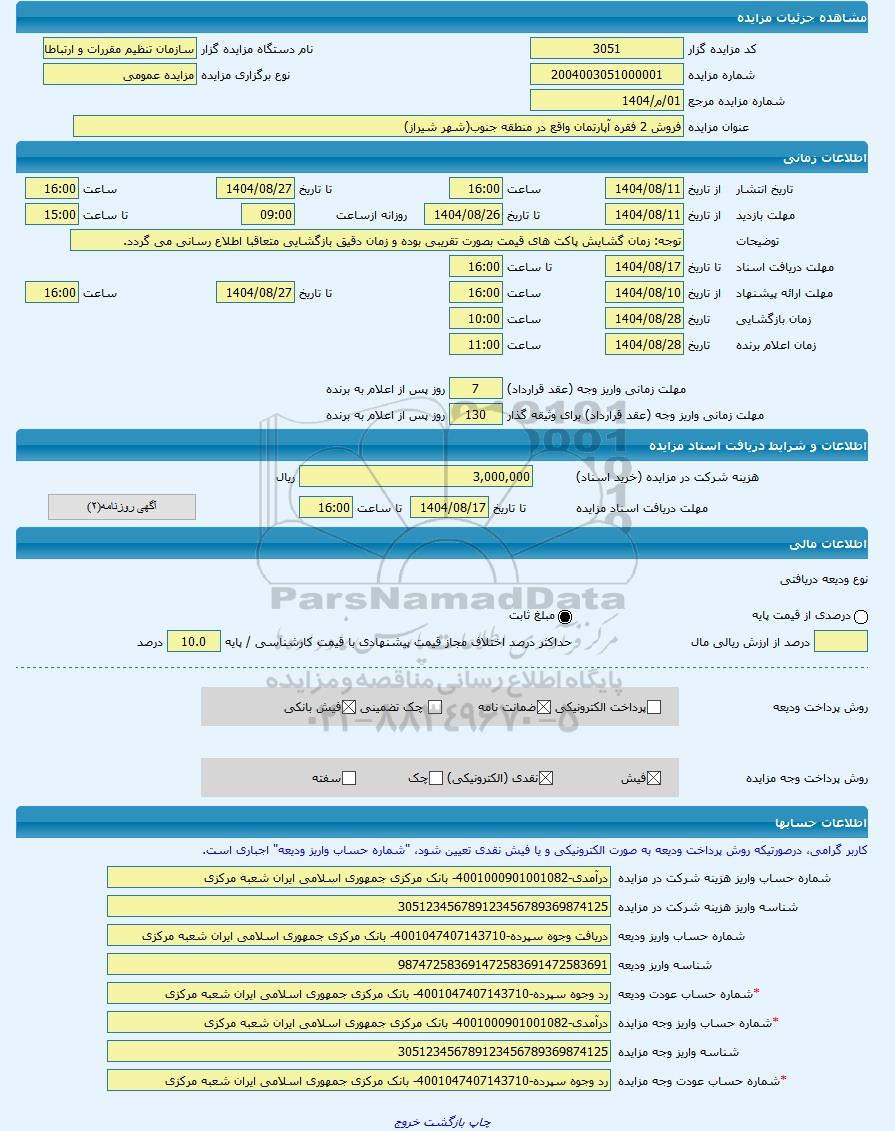 | عنوان مزایده | فروش 2 فقره آپارتمان واقع در منطقه جنوب(شهر شیراز) -مزایده آپارتمان - استان فارس | |||