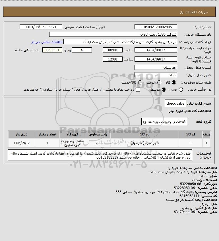 استعلام بها و موضوع استعلام استعلام check valve به اطلاع کلیه شرکتها و افراد متخصص واجد شرایط میرساند، آگهی گذار در نظر دارد از طریق استعلام بها، نسبت به انتخاب و دریافت پیشنهادات اقدام نماید. این استعلام با کد آگهی ثبت شده در سامانه خبرگزاری پارس نماد : 9791621 منتشر شده است. مشخصات استعلام : تاریخ شروع استعلام: 1404/08/12 آخرین مهلت ارسال پیشنهاد قیمت : 1404/08/17 و محل اجرای پروژه : استان خوزستان میباشد. استعلام قیمت مورد درخواست : استعلام check valve با دستهبندیهای تخصصی و گروه های مرتبط : ابزار دقیق, تاسیسات ساختمانی, شیرآلات, تجهیزات نفت و گاز, استعلام اطلاع رسانی میگردد.