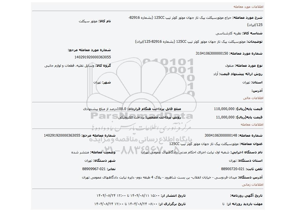 مزایده عمومی مزایده موتورسیکلت پیک تاز جهان موتور کوثر تیپ 125CC (بشماره 82916-125/ایران) برگزار میگردد. از کلیه افراد متخصص و شرکت‌های واجد شرایط دعوت به عمل می‌آید تا در این مزایده با کد خبرگزاری پارس نماد : 9791694 شرکت نمایند تاریخ شروع مزایده : 1404/08/11 مهلت شرکت در مزایده: تا پایان روز 1404/08/24 مکان برگزاری اموال واگذاری استان‌های مزایدات استان تهران و دسته‌بندی‌های مربوط به این حراجی موتور سیکلت میباشد.