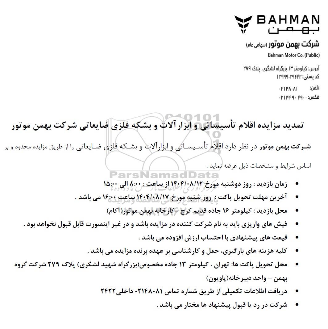 تمدید مزایده اقلام تأسیساتی و ابزارآلات و بشکه فلزی ضایعاتی شرکت بهمن موتور