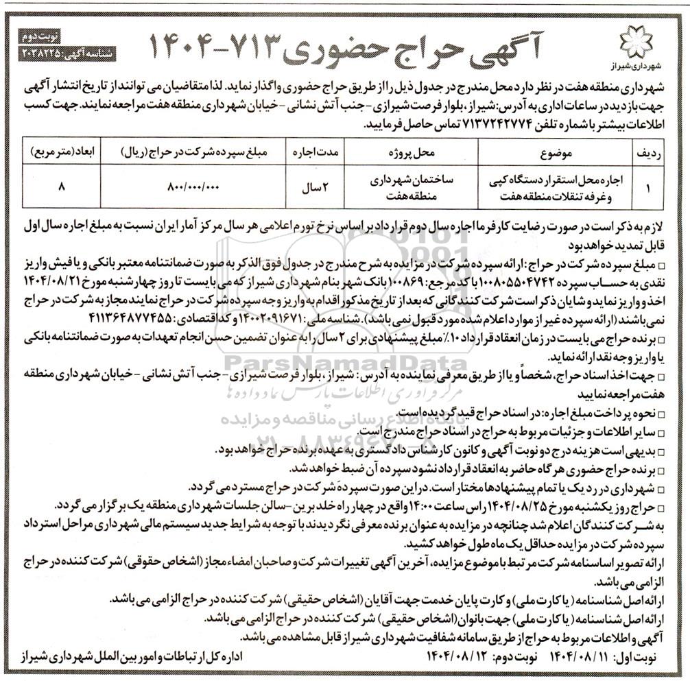 شهرداری منطقه هفت در نظر دارد محل مندرج در جدول ذیل را از طریق حراج حضوری واگذار نماید. لذا متقاضیان می توانند از تاریخ انتشار آگهی جهت بازدید در ساعات اداری به آدرس : شیراز ، بلوار فرصت شیرازی- جنب آتش نشانی - خیابان شهرداری منطقه هفت مراجعه نمایند. جهت کسب اطلاعات بیشتر با شماره تلفن 7137242774 تماس حاصل فرمایید.