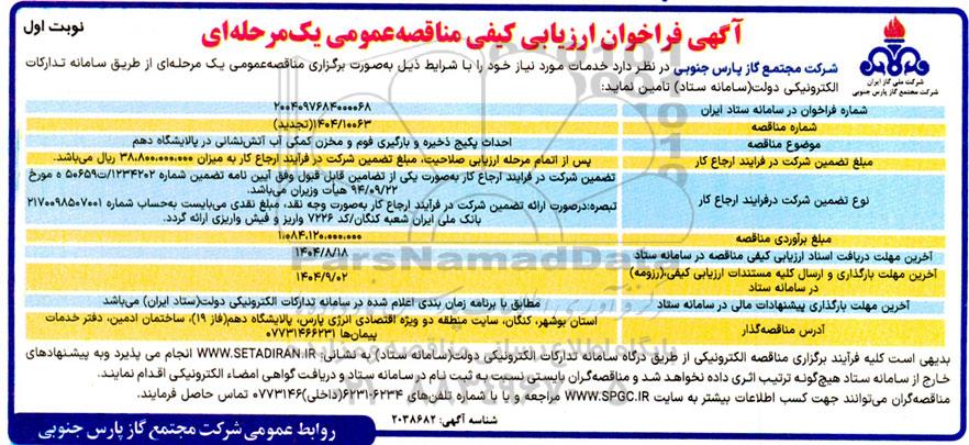 شرکت مجتمع گاز پارس جنوبی در نظر دارد خدمات مورد نیاز خود را با شرایط ذیل به صورت برگزاری مناقصه عمومی یک مرحله ای از طریق سامانه تدارکات الکترونیکی دولت تامین نماید.