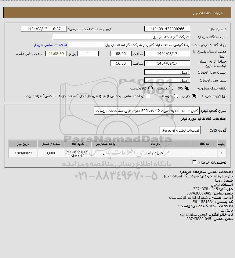 شرح کلی نیاز: کابل out door به صورت 2 کلاف 500 متری طبق مشخصات پیوست