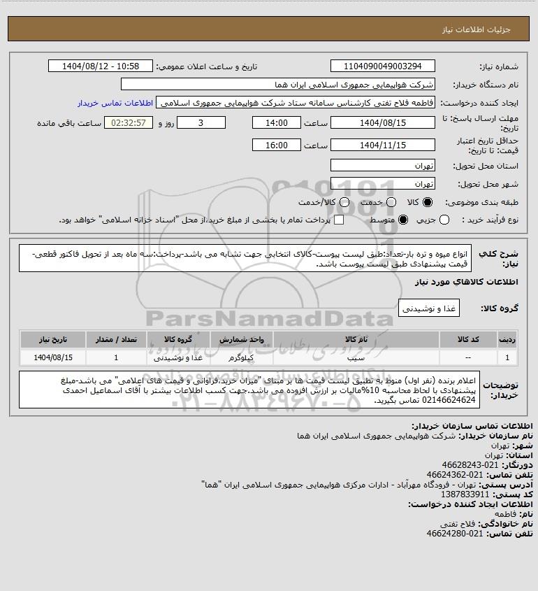 استعلام بها و موضوع استعلام استعلام انواع میوه و تره بار-تعداد:طبق لیست پیوست-کالای انتخابی جهت تشابه می باشد-پرداخت:سه ماه بعد از تحویل فاکتور قطعی-قیمت پیشنهادی طبق لیست پیوست باشد. به اطلاع کلیه شرکتها و افراد متخصص واجد شرایط میرساند، آگهی گذار در نظر دارد از طریق استعلام بها، نسبت به انتخاب و دریافت پیشنهادات اقدام نماید. این استعلام با کد آگهی ثبت شده در سامانه خبرگزاری پارس نماد : 9792386 منتشر شده است. مشخصات استعلام : تاریخ شروع استعلام: 1404/08/12 آخرین مهلت ارسال پیشنهاد قیمت : 1404/08/15 و محل اجرای پروژه : استان تهران میباشد. استعلام قیمت مورد درخواست : استعلام انواع میوه و تره بار-تعداد:طبق لیست پیوست-کالای انتخابی جهت تشابه می باشد-پرداخت:سه ماه بعد از تحویل فاکتور قطعی-قیمت پیشنهادی طبق لیست پیوست باشد. با دستهبندیهای تخصصی و گروه های مرتبط : مواد غذایی, استعلام اطلاع رسانی میگردد.