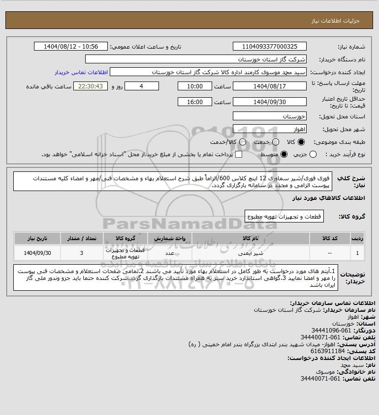 شرح کلی نیاز: فوری فوری/شیر سماوری 12 اینچ کلاس 600/الزاماً طبق شرح استعلام بهاء و مشخصات فنی/مهر و امضاء کلیه مستندات پیوست الزامی و مجدد در سامانه بارگزاری گردد.
