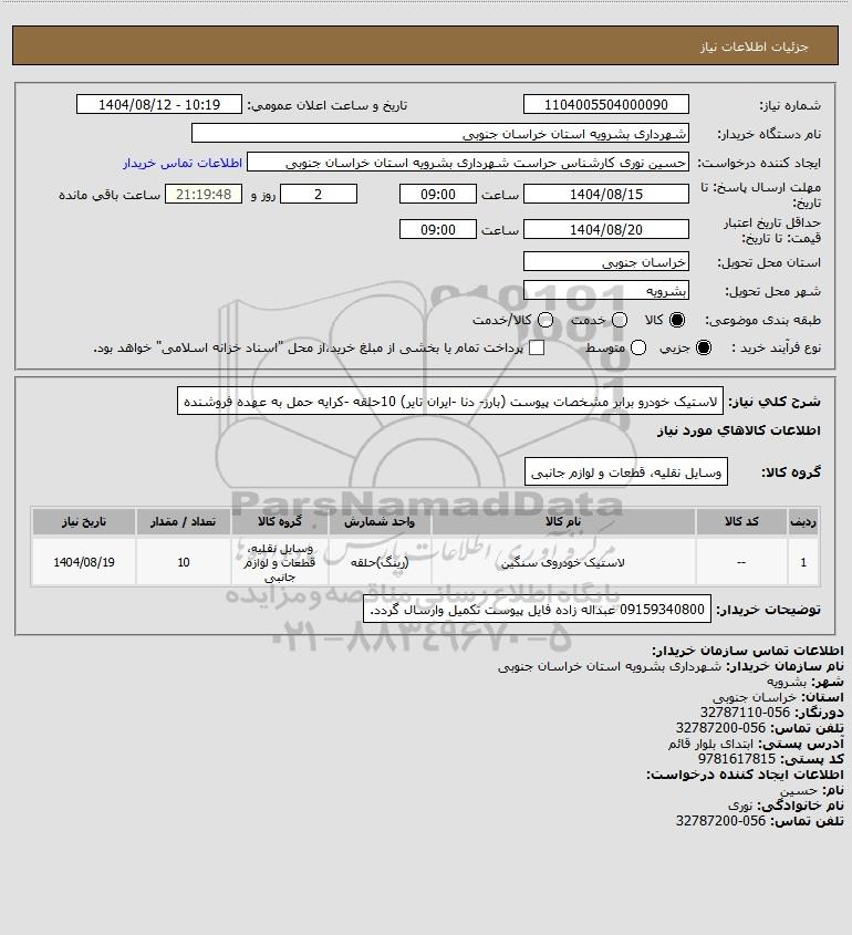 | 1 | -- | لاستیک خودروی سنگین | (رینگ)حلقه | وسایل نقلیه، قطعات و لوازم جانبی | 10 | 1404/08/19 |