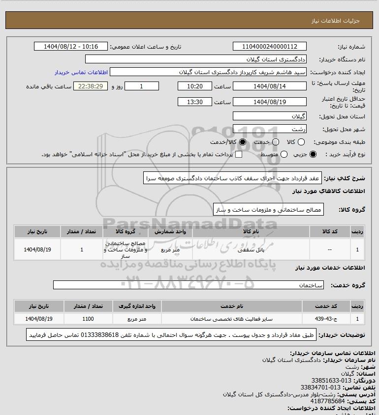 شرح کلی نیاز: عقد قرارداد جهت اجرای سقف کاذب ساختمان دادگستری صومعه سرا
