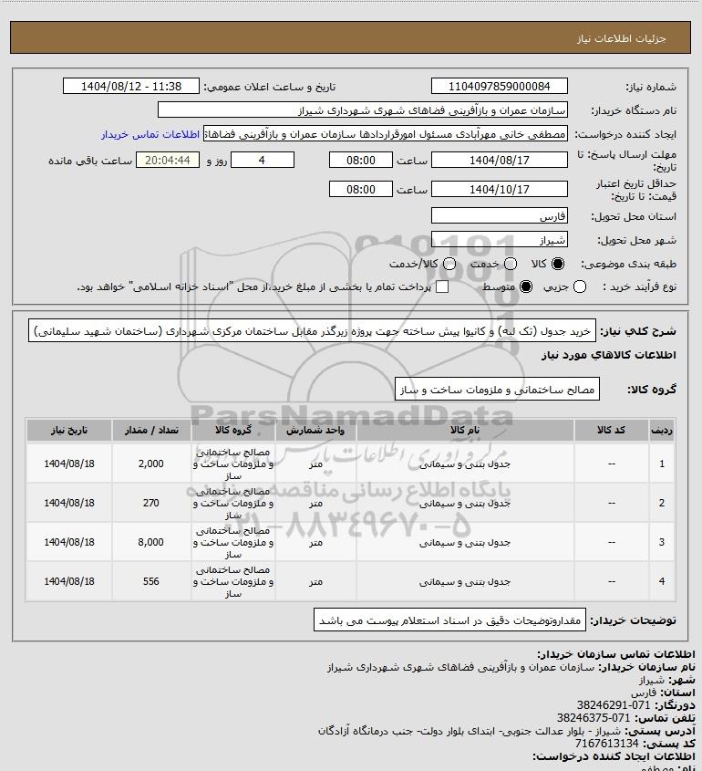 | 3 | -- | جدول بتنی و سیمانی | متر | مصالح ساختمانی و ملزومات ساخت و ساز | 8,000 | 1404/08/18 |