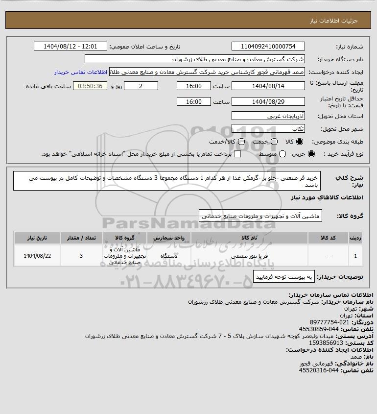 نام دستگاه خریدار:شرکت گسترش معادن و صنایع معدنی طلای زرشوران