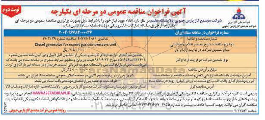 مناقصه disel generator for export gas compressors unit - نوبت دوم از کلیه افراد متخصص و شرکتها واجد شرایط دعوت به عمل میآید در مناقصه با کد خبرگزاری پارس نماد: 9793120 شرکت نمایند.