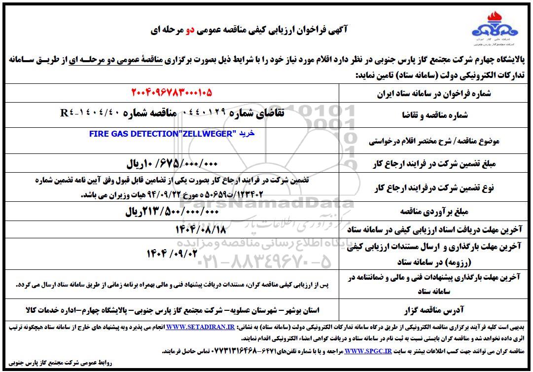 فراخوان ارزیابی کیفی مناقصه خرید FIRE GAS DETECTION ZELLWEGER از کلیه افراد متخصص و شرکتها واجد شرایط دعوت به عمل میآید در مناقصه با کد خبرگزاری پارس نماد: 9793133 شرکت نمایند.