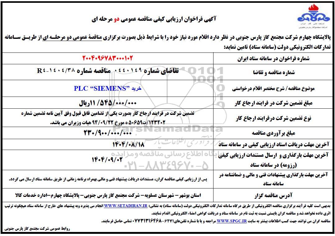 فراخوان ارزیابی کیفی مناقصه خرید PLC "SIEMENS" از کلیه افراد متخصص و شرکتها واجد شرایط دعوت به عمل میآید در مناقصه با کد خبرگزاری پارس نماد: 9793140 شرکت نمایند.