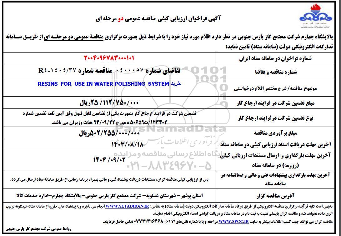 فراخوان ارزیابی کیفی مناقصه خرید RESINS FOR USE IN WATER POLISHING SYSTEM از کلیه افراد متخصص و شرکتها واجد شرایط دعوت به عمل میآید در مناقصه با کد خبرگزاری پارس نماد: 9793148 شرکت نمایند.