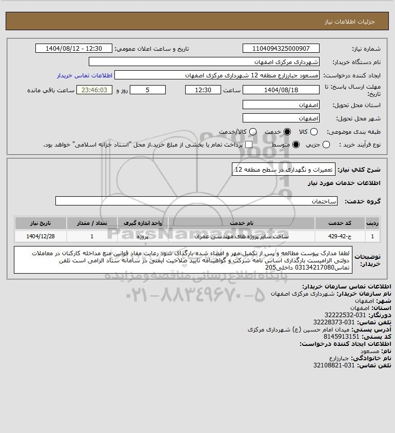 شرح کلی نیاز: تعمیرات و نگهداری در سطح منطقه 12