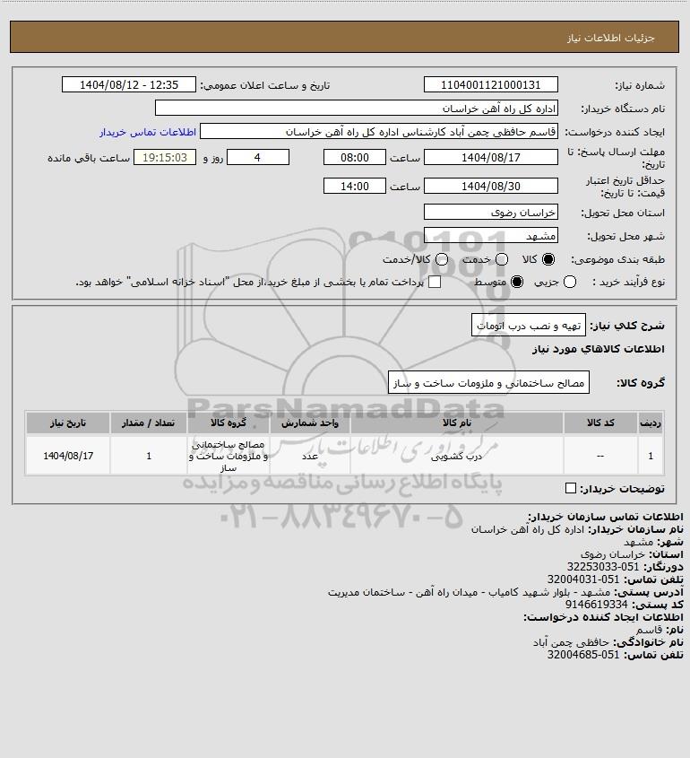 استعلام تهیه و نصب درب اتومات, استعلام تهیه و نصب درب اتومات