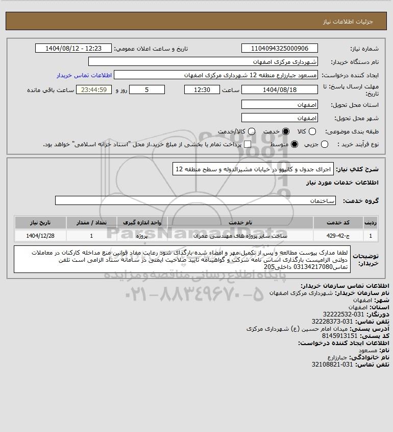 شرح کلی نیاز: اجرای جدول و کانیوو در خیابان مشیرالدوله و سطح منطقه 12