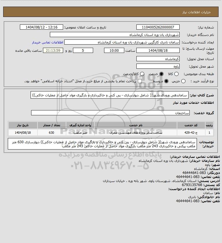 شرح کلی نیاز: ساماندهی ورودی شهر(( شامل دیوارسازی - پی کنی و خاکبرداری و بارگیری مواد حاصل از عملیات خاکی))