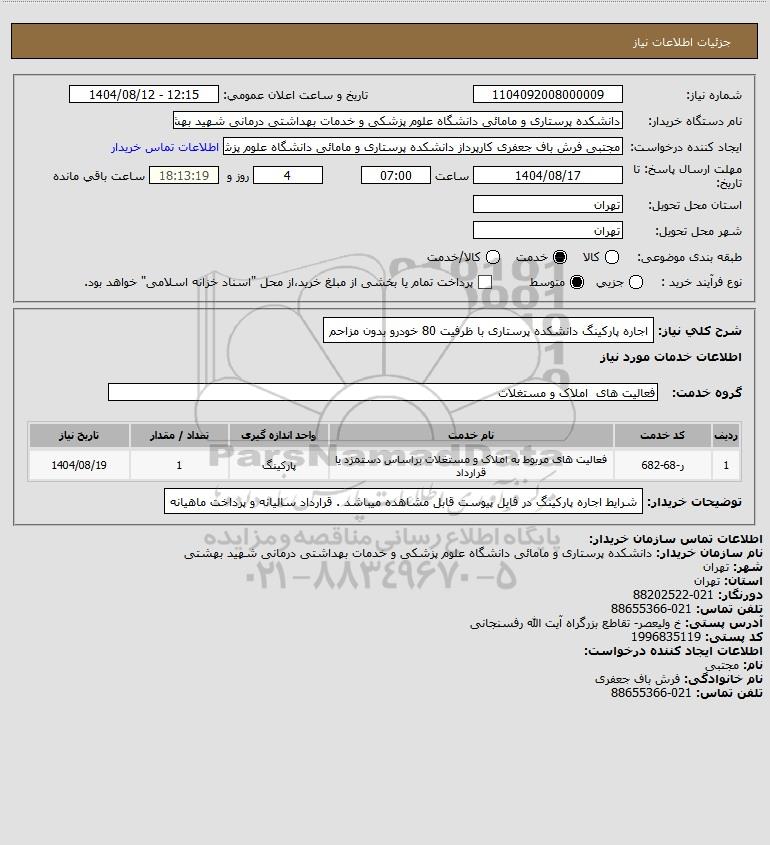 شرح کلی نیاز: اجاره پارکینگ دانشکده پرستاری با ظرفیت 80 خودرو بدون مزاحم