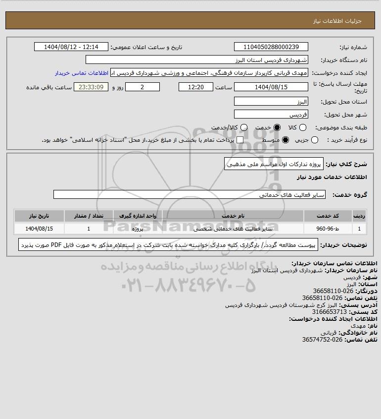 شرح کلی نیاز: پروژه تدارکات اول مراسم ملی مذهبی