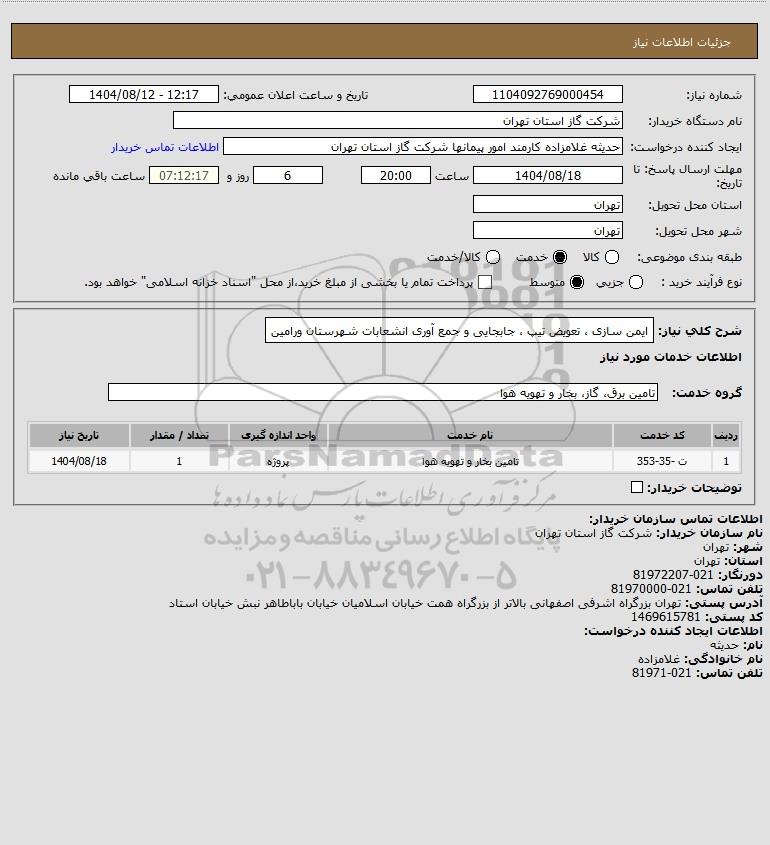 شرح کلی نیاز: ایمن سازی ، تعویض تیپ ، جابجایی و جمع آوری انشعابات شهرستان ورامین