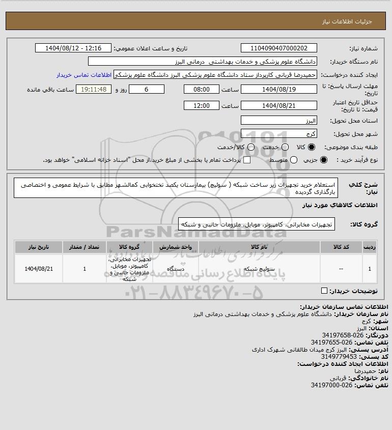 استعلام استعلام خرید تجهیزات زیر ساخت شبکه ( سوئیچ) بیمارستان یکصد تختخوابی کمالشهر مطابق با شرایط عمومی و اختصاصی بارگذاری گردیده, استعلام استعلام خرید تجهیزات زیر ساخت شبکه ( سوئیچ) بیمارستان یکصد تختخوابی کمالشهر مطابق با شرایط عمومی و اختصاصی بارگذاری گردیده