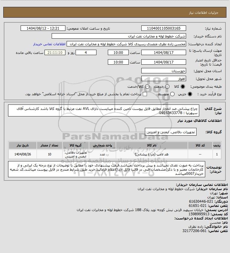 شرح کلی نیاز: چراغ پیشانی ضد انفجار مطابق فایل پیوست تامین کننده میبایست دارای AVL نفت مرتبط با گروه کالا باشد کارشناس آقای سپهرنیا : 09163433778
