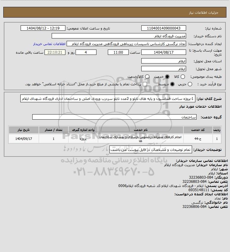 شرح کلی نیاز: 1-پروژه ساخت فنداسیون و پایه های تابلو و 2عدد تابلو سردرب ورودی اصلی و ساختمان اداری فرودگاه شهدای ایلام