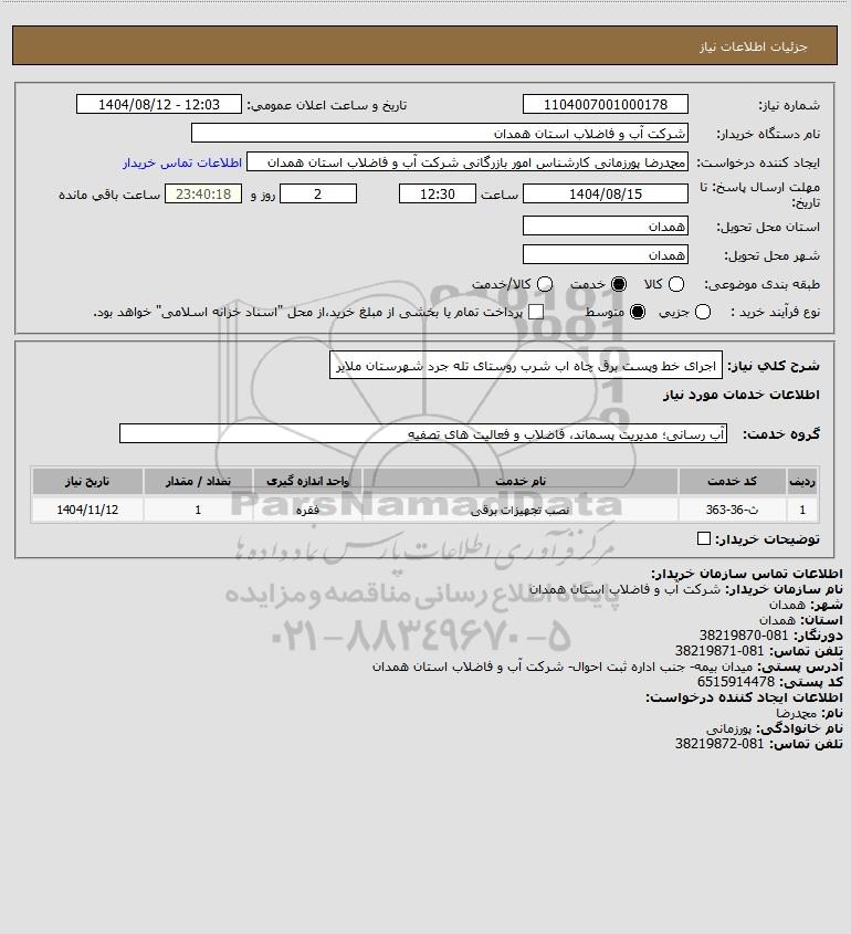 شرح کلی نیاز: اجرای خط وپست برق چاه اب شرب روستای تله جرد شهرستان ملایر