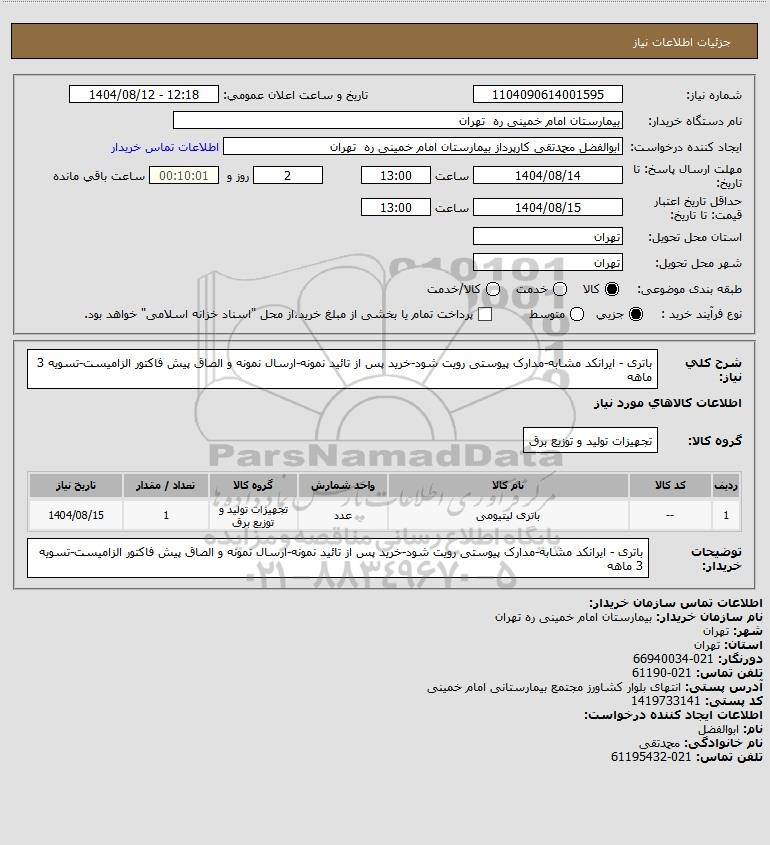 شرح کلی نیاز: باتری - ایرانکد مشابه-مدارک پیوستی رویت شود-خرید پس از تائید نمونه-ارسال نمونه و الصاق پیش فاکتور الزامیست-تسویه 3 ماهه