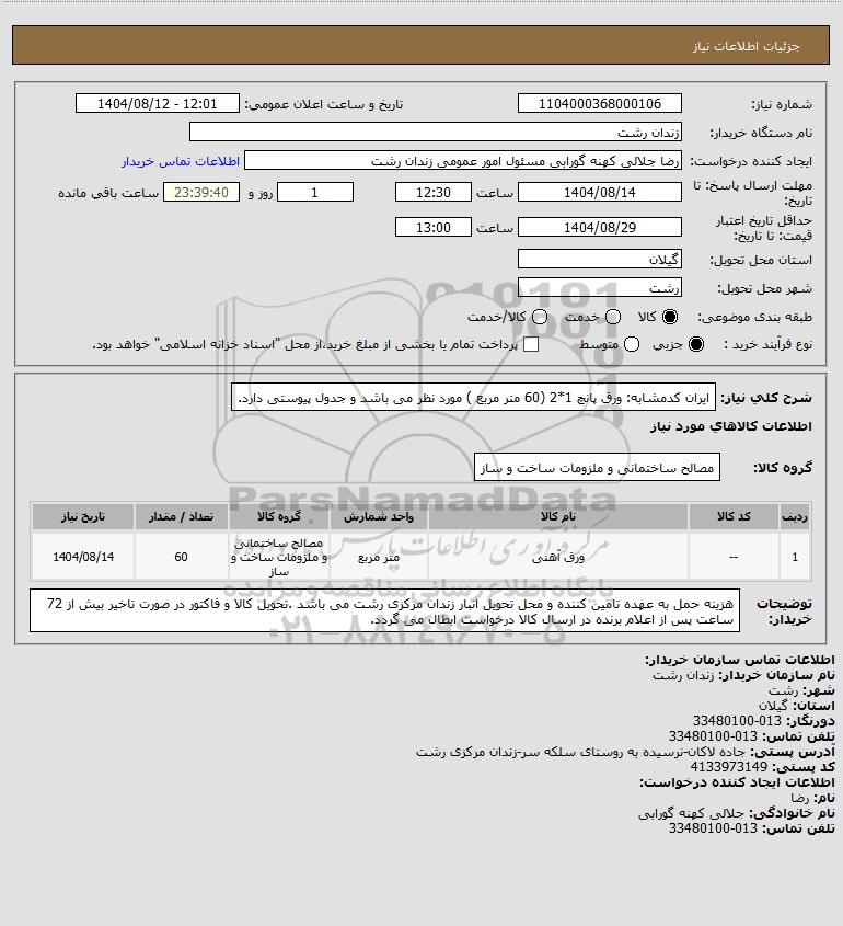 شرح کلی نیاز: ایران کدمشابه: ورق پانچ 1*2 (60 متر مربع ) مورد نظر می باشد و جدول پیوستی دارد.