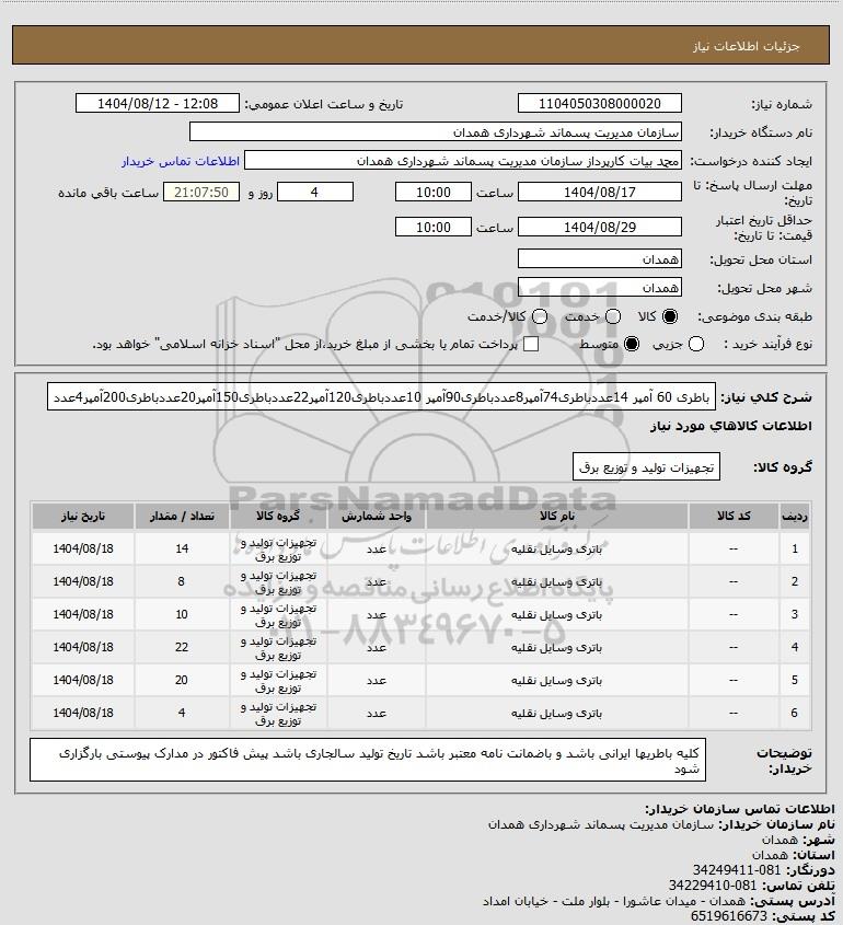 | 5 | -- | باتری وسایل نقلیه | عدد | تجهیزات تولید و توزیع برق | 20 | 1404/08/18 |