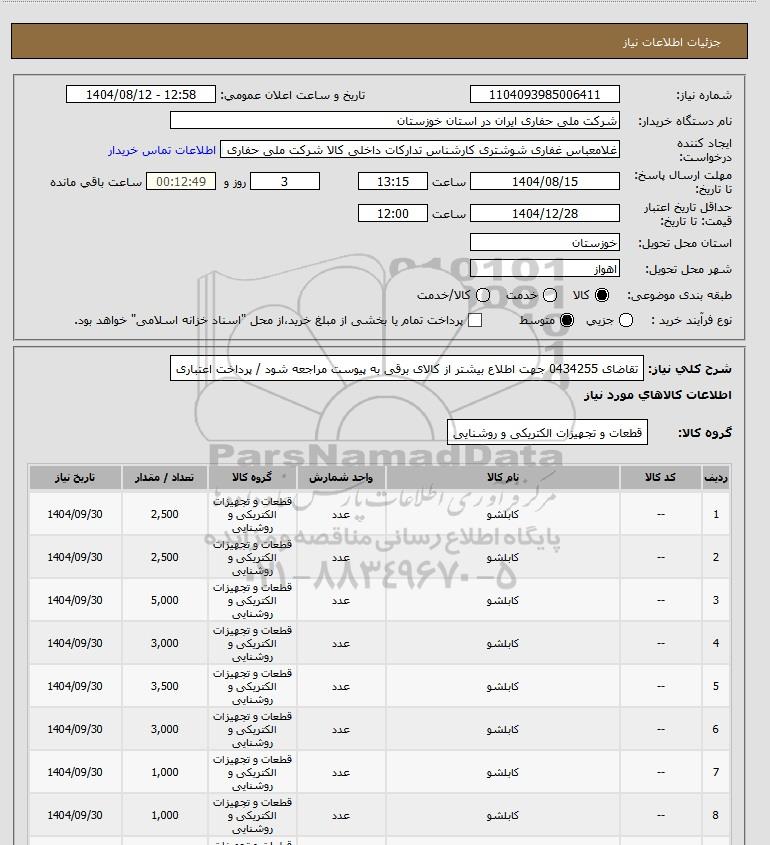 | 3 | -- | کابلشو | عدد | قطعات و تجهیزات الکتریکی و روشنایی | 5,000 | 1404/09/30 |