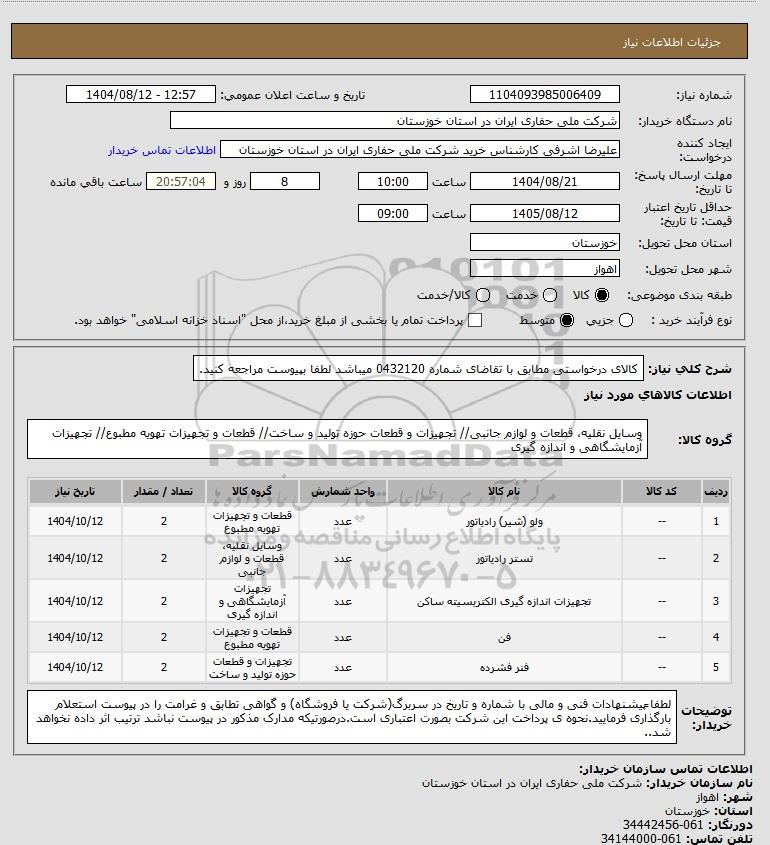 شرح کلی نیاز: کالای درخواستی مطابق با تقاضای شماره 0432120 میباشد لطفا بپیوست مراجعه کنید.