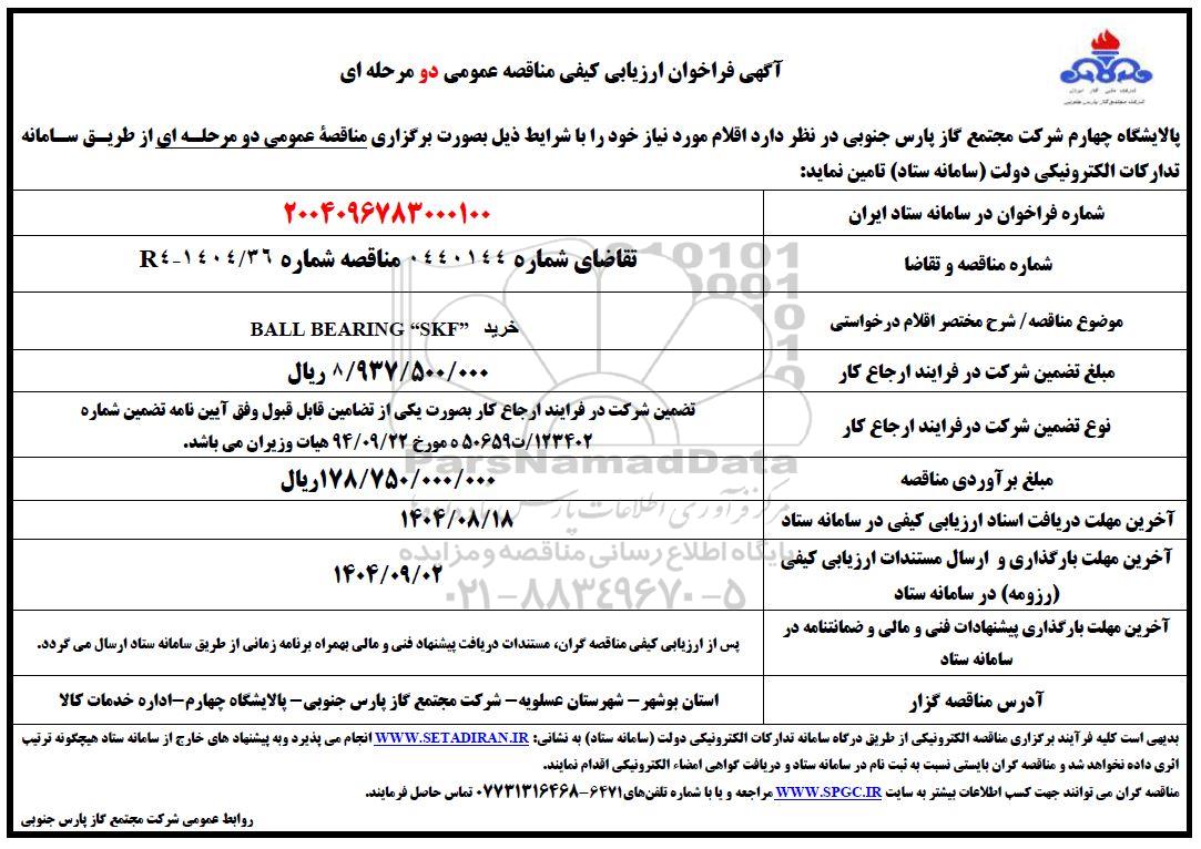 فراخوان ارزیابی کیفی مناقصه خرید BALL BEARING "SKF", فراخوان ارزیابی کیفی مناقصه خرید BALL BEARING "SKF"