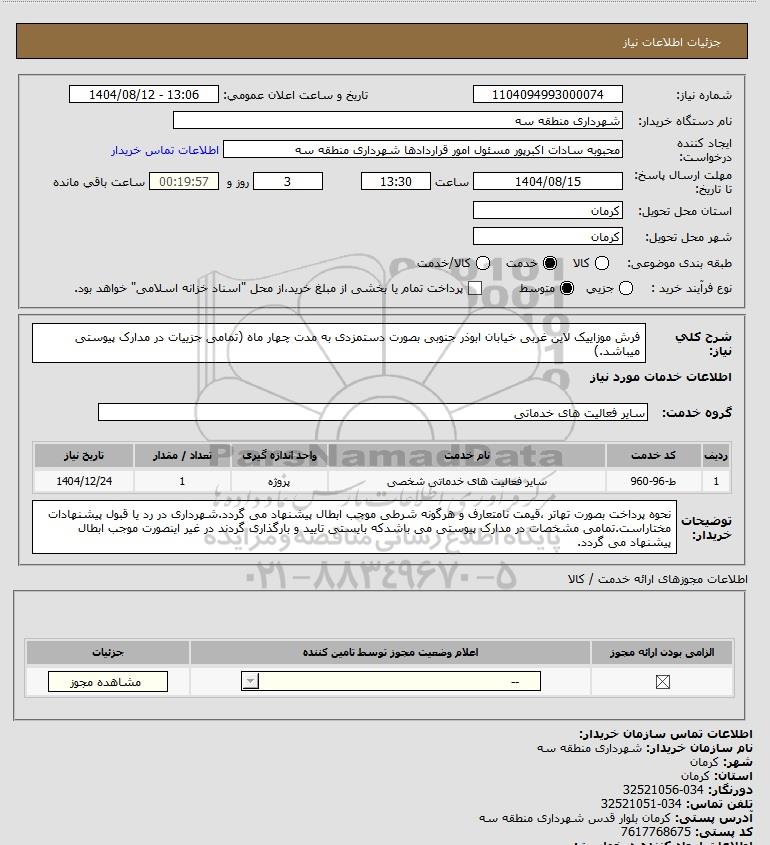 شرح کلی نیاز: فرش موزاییک لاین غربی خیابان ابوذر جنوبی بصورت دستمزدی به مدت چهار ماه (تمامی جزییات در مدارک پیوستی میباشد.)