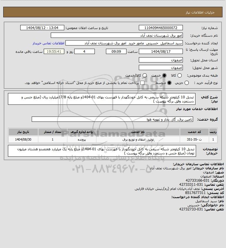 شرح کلی نیاز: تبدیل 10 کیلومتر شبکه سیمی به کابل خودنگهدار با فهرست بهای 01-1404و مبلغ پایه 17/8میلیارد ریال (مبلغ جنس و دستمزد وفق برگه پیوست )