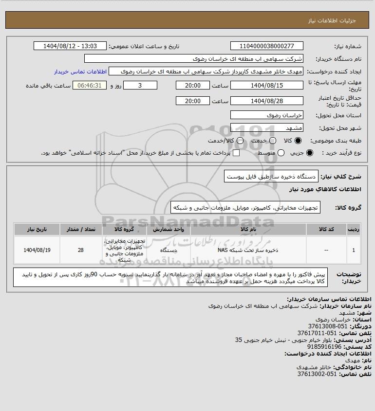 نام دستگاه خریدار:شرکت سهامی اب منطقه ای خراسان رضوی