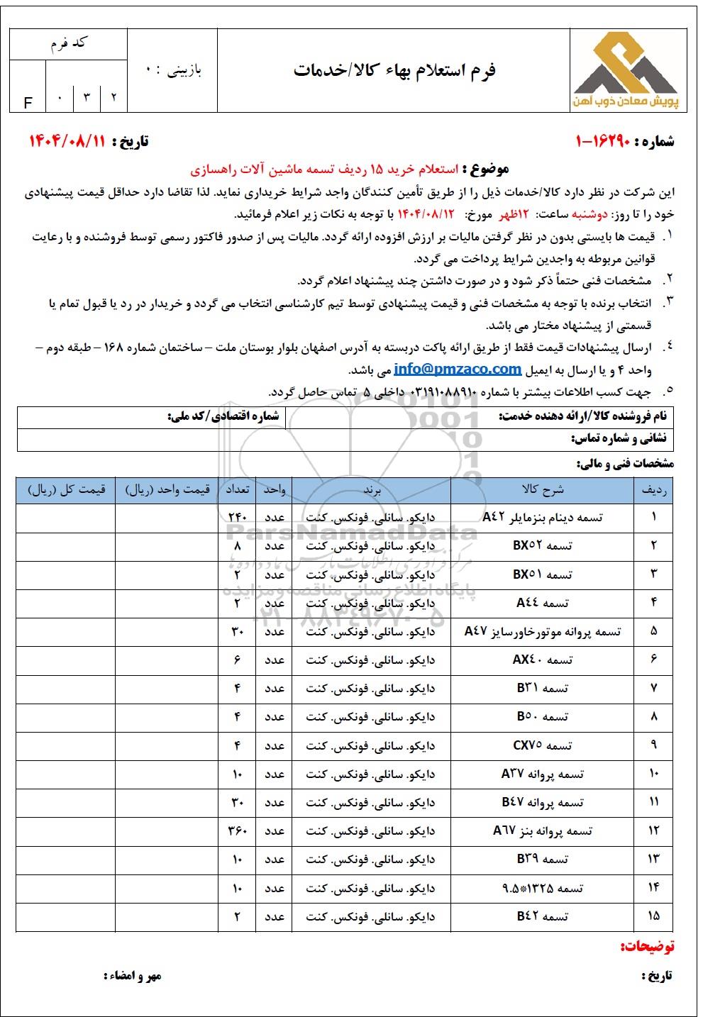 این شرکت در نظر دارد کالا/ خدمات ذیل را از طریق تأمین کنندگان واجد شرایط خریداری نماید. لذا تقاضا دارد حداقل قیمت پیشنهادی خود را تا روز دوشنبه ساعت 12 ظهر مورخ 1404.08.12 با توجه به نکات زیر اعلام فرمائید.